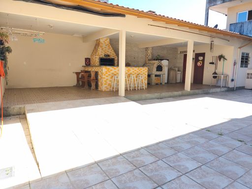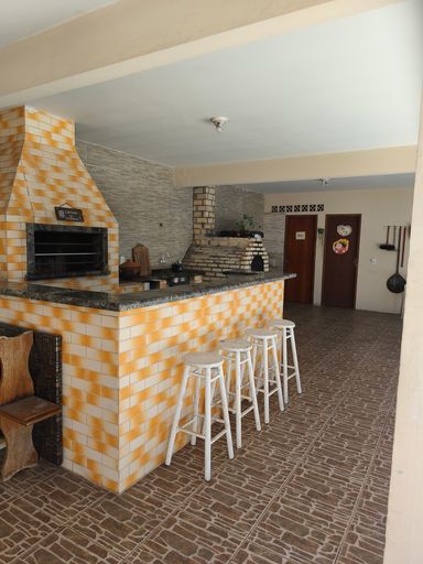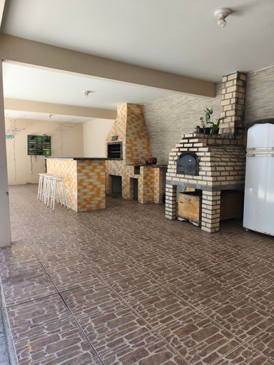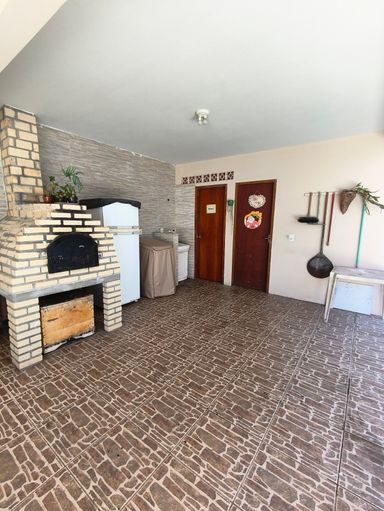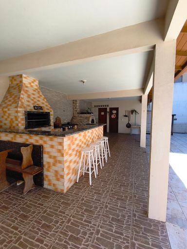 A área gourmet no fundo do terreno possui 68 metros quadrados e é térrea. Ela possui 1 banheiro, 1 quarto, churrasqueira, fogão a lenha, forno de pizza e lavanderia
